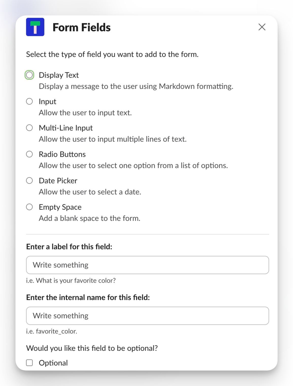 Once you select an element type, you can now fill in the label and the internal name for the field. The label is the public-facing text shown to the user, while the internal name is used for API and data purposes. For example: